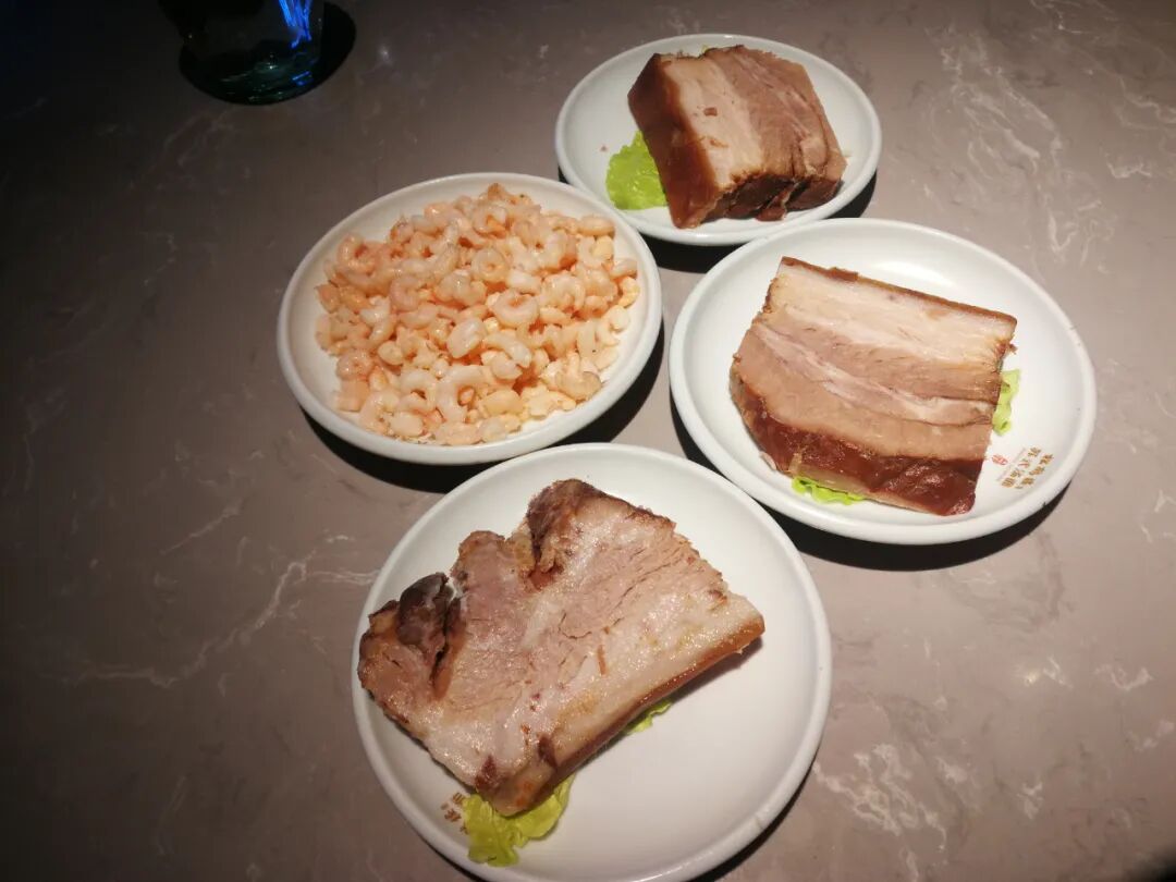 女服务员首先端上来三大块厚厚的带皮和肥肉的焖肉及虾仁。看到我有些畏惧的表情,很注意保养身材的朋友说:“猪油已被煸出,因此肥而不腻。一会需要泡到汤面里吃。”