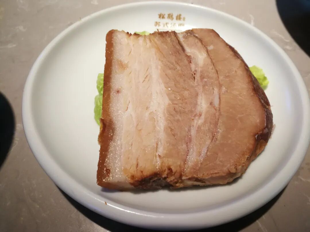 据松鹤楼苏式汤面馆介绍,这块别具风味的焖肉精选上等肥瘦相间五花肉,加入古法特制秘方烹制,经文武火焖制六小时而成。吃的时候,汤油润鲜美,肉更是入口即化,连薄薄的肉皮儿都韧糯入味,丰腴鲜美、回味无穷~(我不应该把垫肉的菜放进去,破坏了整体的感觉。)