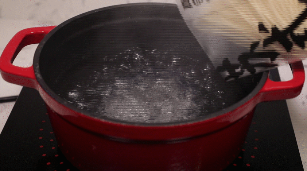 第二步:锅中加入足量水煮沸,将苏式半干面加入沸水锅内,稍稍搅拌使其散开,大火煮60至90秒,推荐60秒口感最佳。