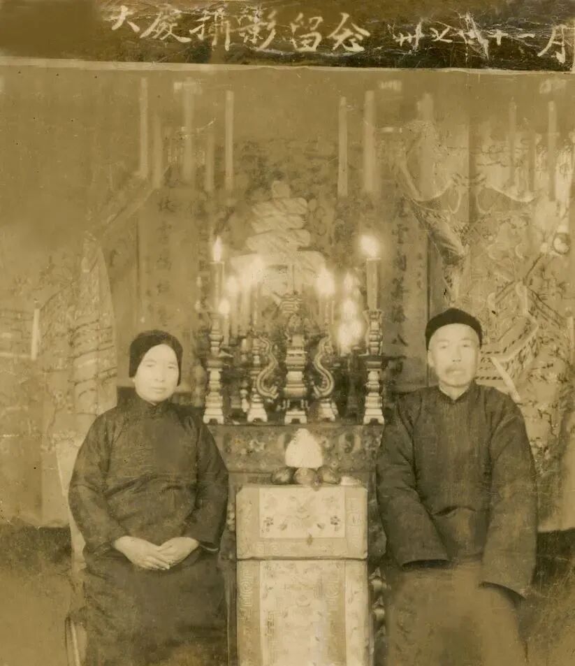 1948年,松江松鹤楼、迎宾楼创始人吴荣茂(1879—1959)七十寿辰时与其妻丁大妹(1893—1966)在无锡洛社东安庄祖宅的合影(吴宗玉 供图)