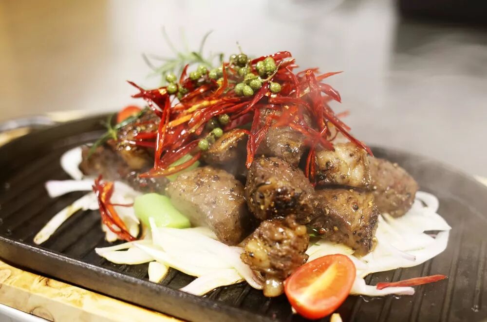这是松鹤楼里要跑着上的一道菜。经过低温慢煮的安格斯牛肉粒,稍做翻炒,收住肉汁,烧热铁板,将黑胡椒、辣椒丝、花椒等数味香料置于嫩牛肉粒上,再浇上热油,滋滋作响……这个过程只有十几秒,必须要在这之前上桌。