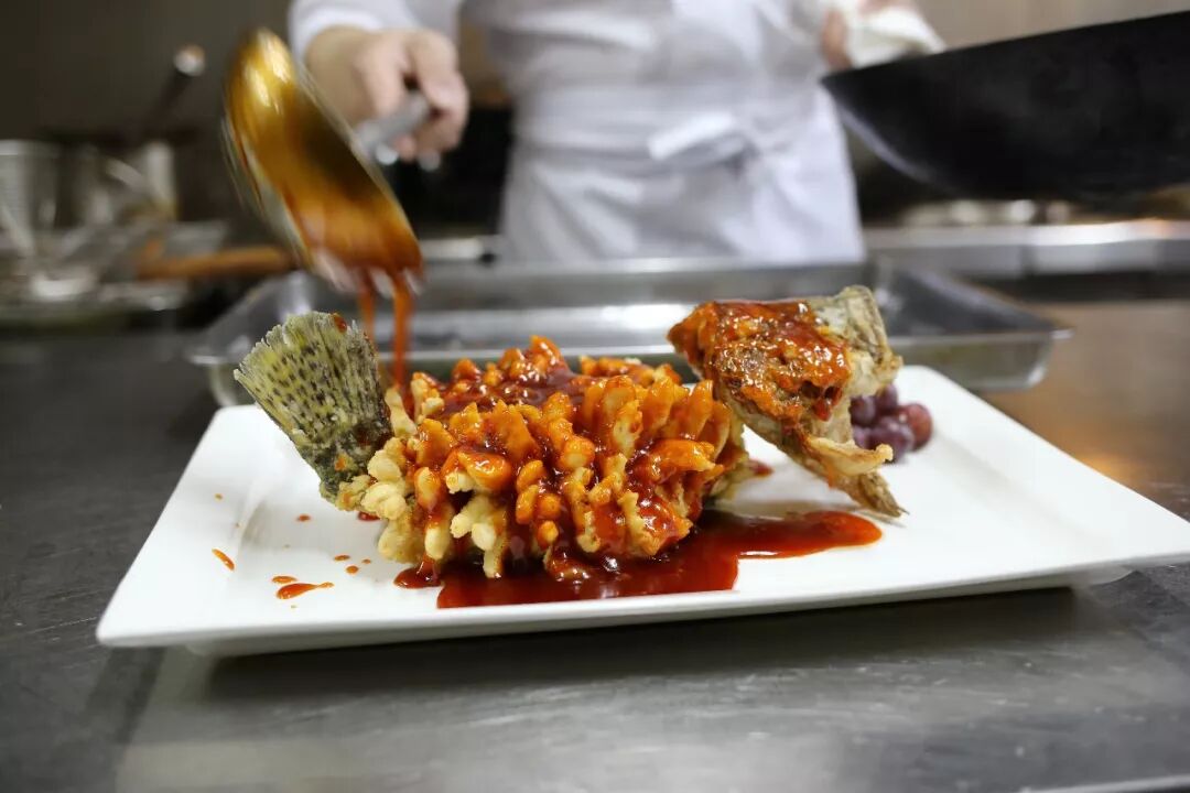 松鼠桂鱼是松鹤楼的招牌菜,这道菜就是从松鹤楼传承出来的,已成为一种烹鱼工艺,讲究刀工火候。