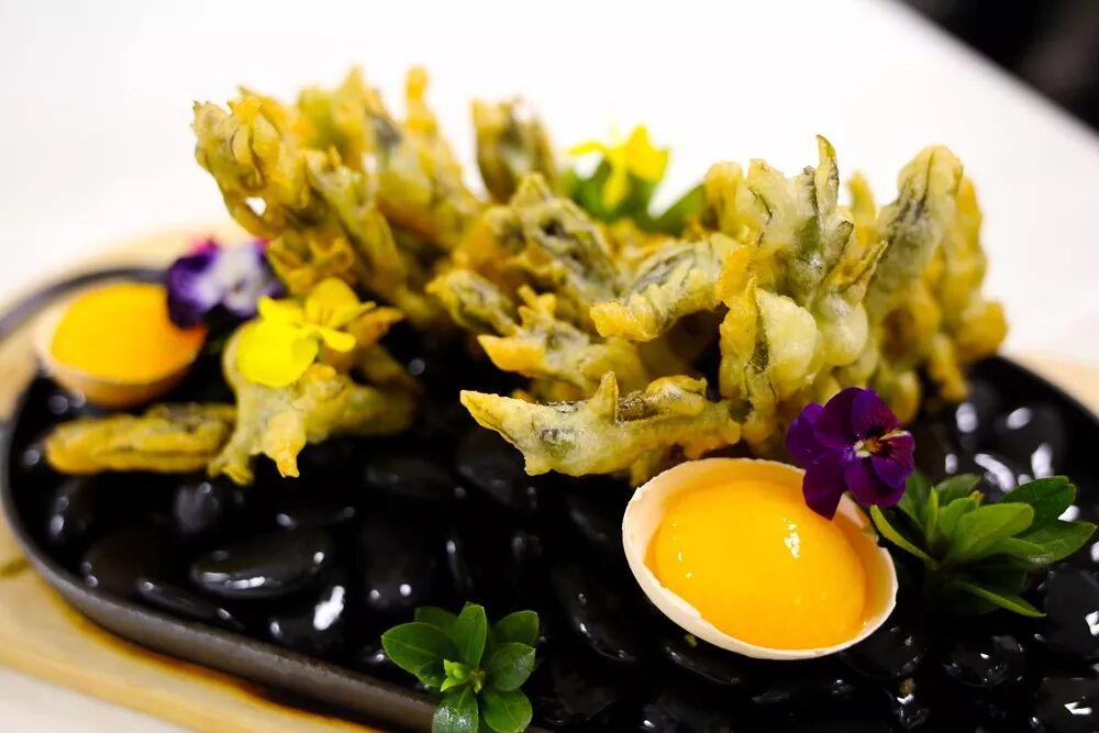 望椿,即香椿头,香椿头整个快速焯水,嫩芽不能蔫,再裹上特调的面糊油炸,面糊很薄,这样入锅油炸才能呈现香脆薄透的外形,隐约透出香椿头的颜色,足见苏帮菜之精致。