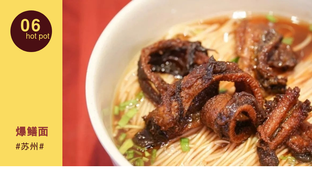 苏州的爆鳝面也是一绝,它是鳝片生爆成黄脆,再加入酱油、绍酒、糖、肉清汤等,经“素油爆、荤油炒、麻油浇”等多道上序精巧烹调而成,面条柔滑、鳝鱼香脆,口感甜而不腻,是非常经典的苏式汤面。