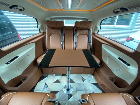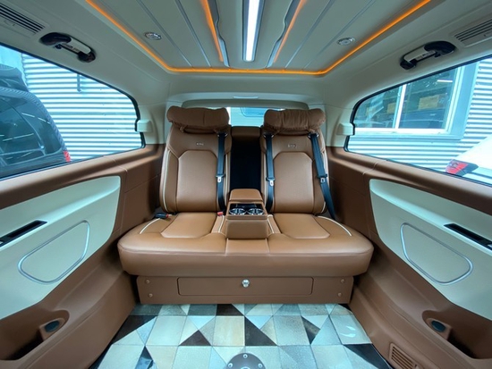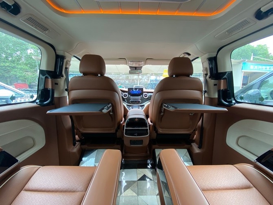 这款奔驰威霆七座商务车的地板重新铺设防滑耐磨防腐蚀的牛皮地毯,顶上再配上简单的氛围灯,营造出令人舒适的乘坐氛围。咨询电话:4009609396 (预约后可视屏看车)