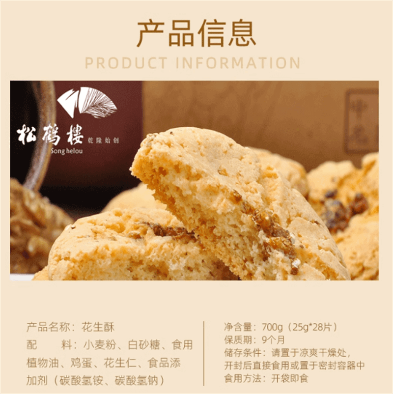 配料表:小麦粉、白砂糖、食用植物油、鸡蛋、花生仁储藏方法:请置于凉爽干燥处,开封后直接食用或置于密封容器中