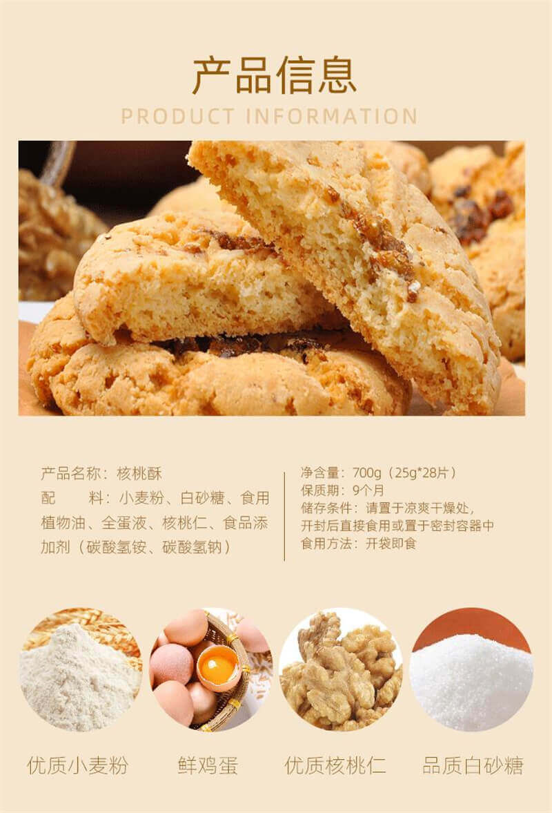 配料表:小麦粉、白砂糖、食用植物油、鸡蛋、核桃仁、食品添加剂