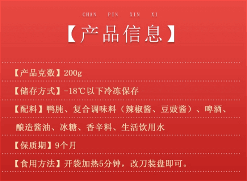 配料表:鸭肫、复合调味料(辣椒酱、豆豉酱)、啤酒、酿造酱油、冰糖、香辛料、生活饮用水
